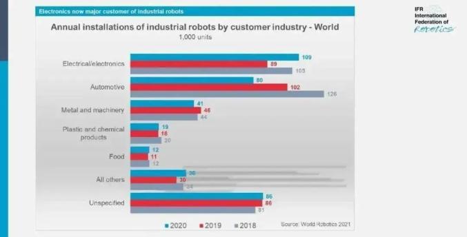 國際機器人聯合會主席米爾頓·格雷(MiltonGuerry)表示:“北美、亞洲和歐洲的經濟體并沒有同時經歷新冠病毒的低點。中國制造業的訂單接收和生產在2020年第二季度開始激增,北美經濟在2020年下半年開始復蘇,歐洲隨后也開始復蘇。”